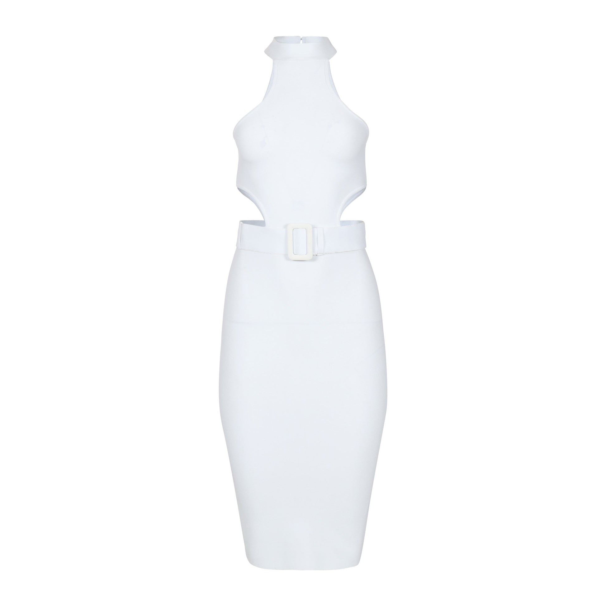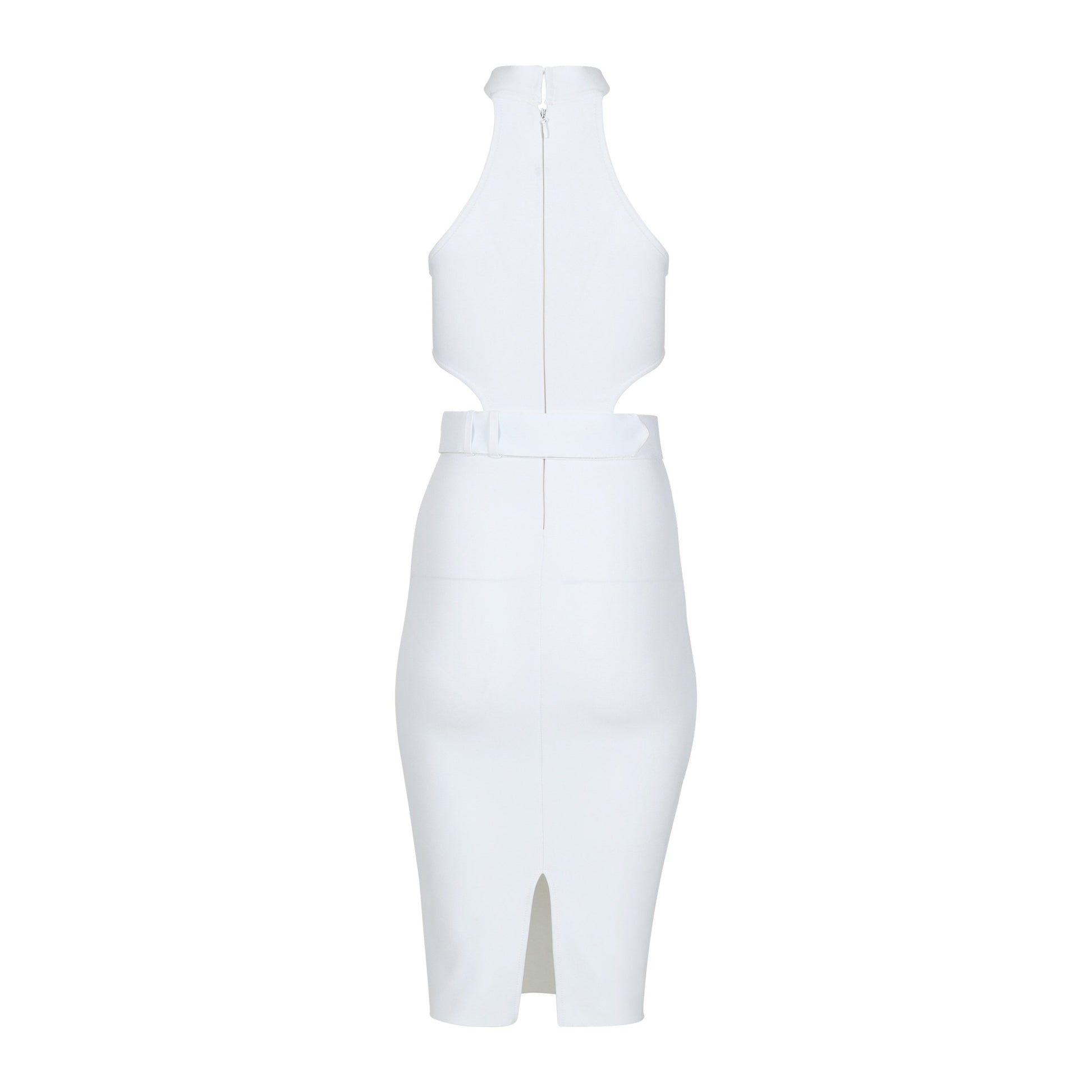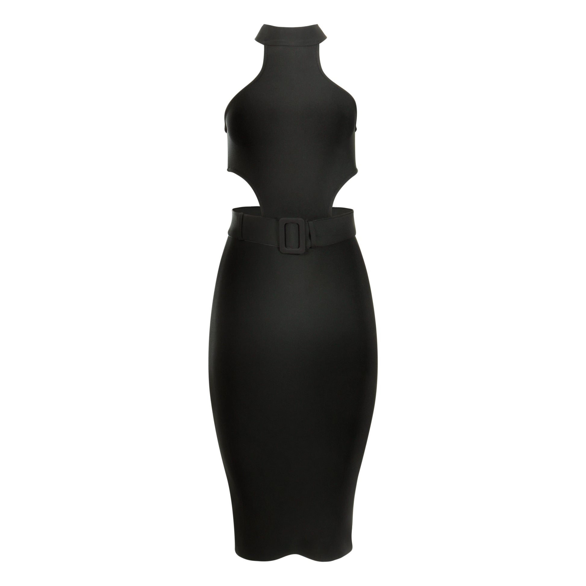 This belted mockneck and shoulder cut-out bandage dress is complete with a doubled zipper for extra comfort.